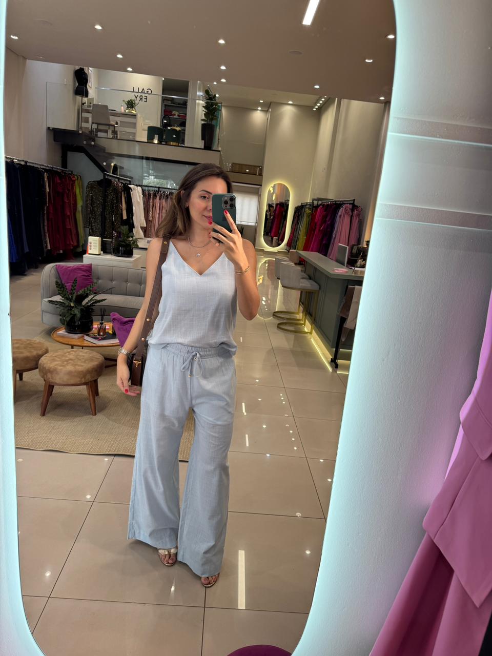 100% algodão, com alcinha regulável e cós da calça de elastico