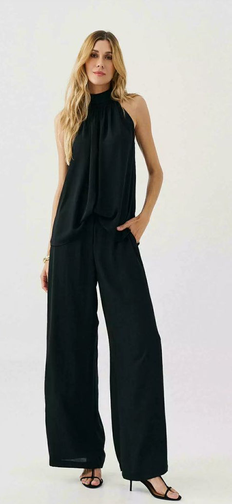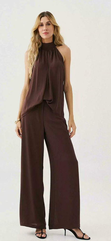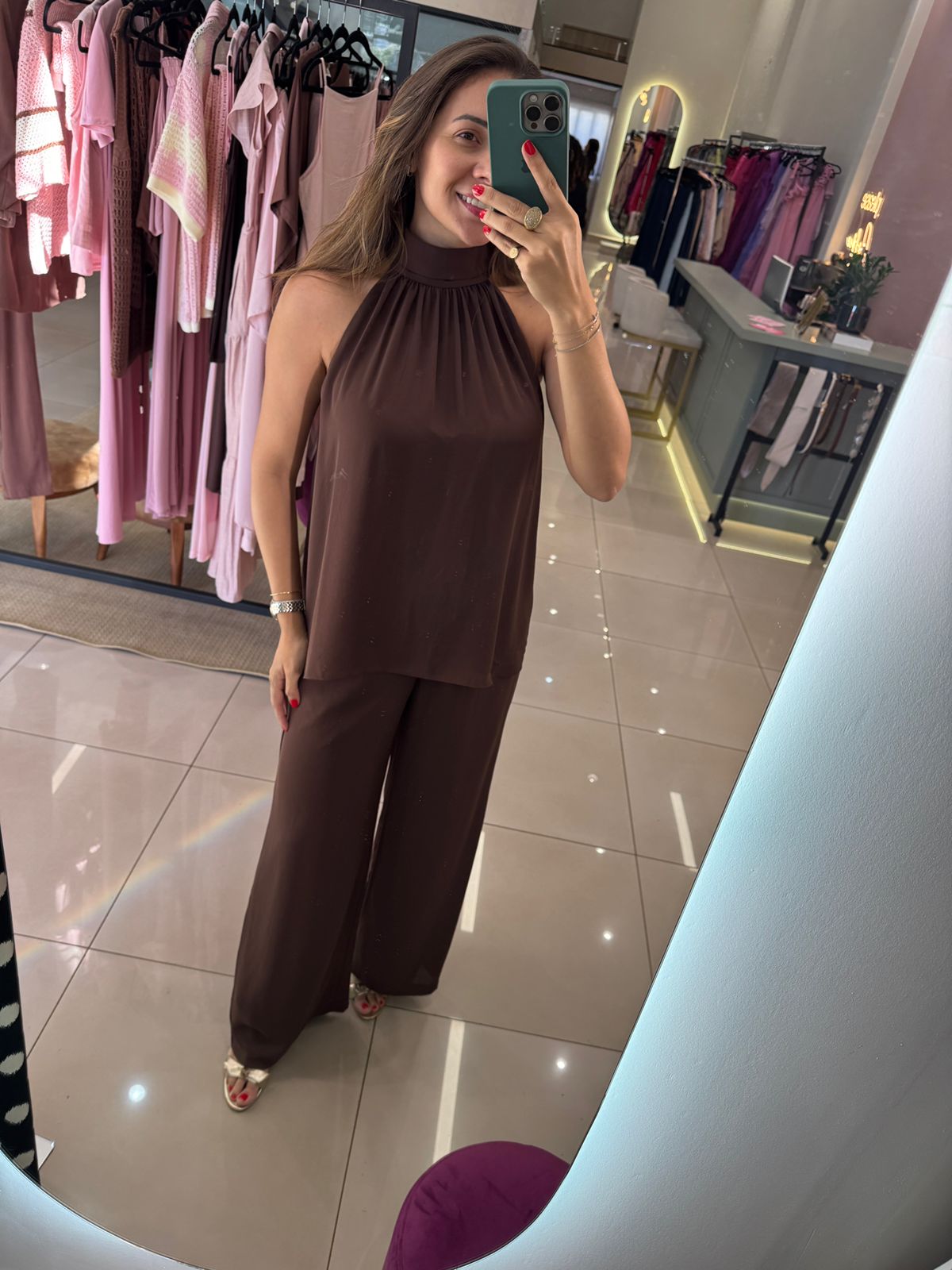 No tecido chiffon, frente unica com elástico no cós da calça na parte de trás.