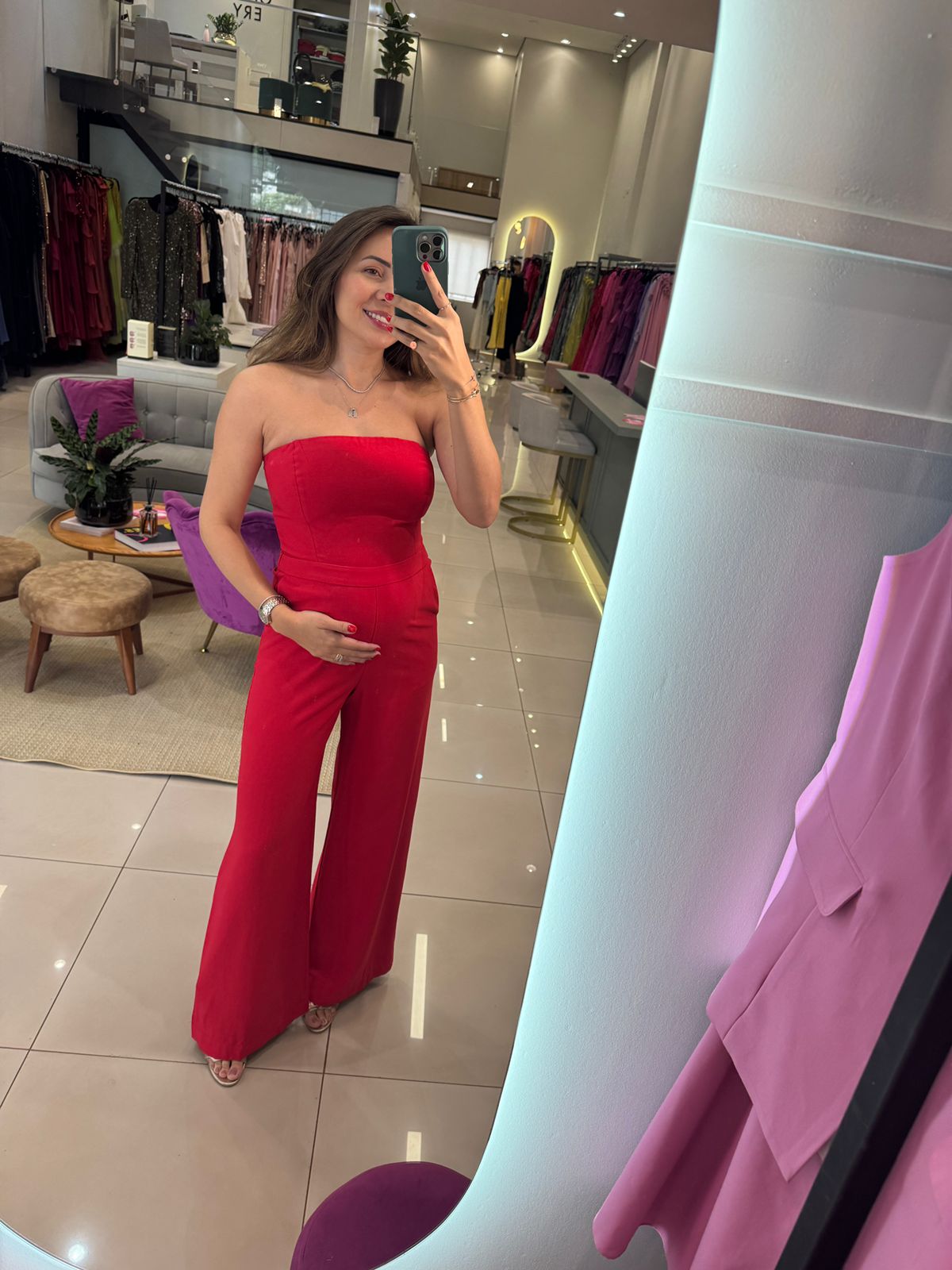 No viscose com poliester, tem o acabamento perfeito com elastico nas costas.
